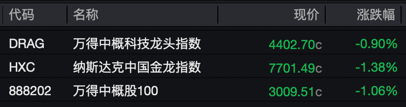 热门中概股多数下跌,纳斯达克中国金龙指数收跌1.38%。蔚来、小鹏汽车跌超4%,理想汽车、新东方跌超3%,哔哩哔哩、名创优品跌超2%,阿里巴巴、百度、拼多多跌超1%。