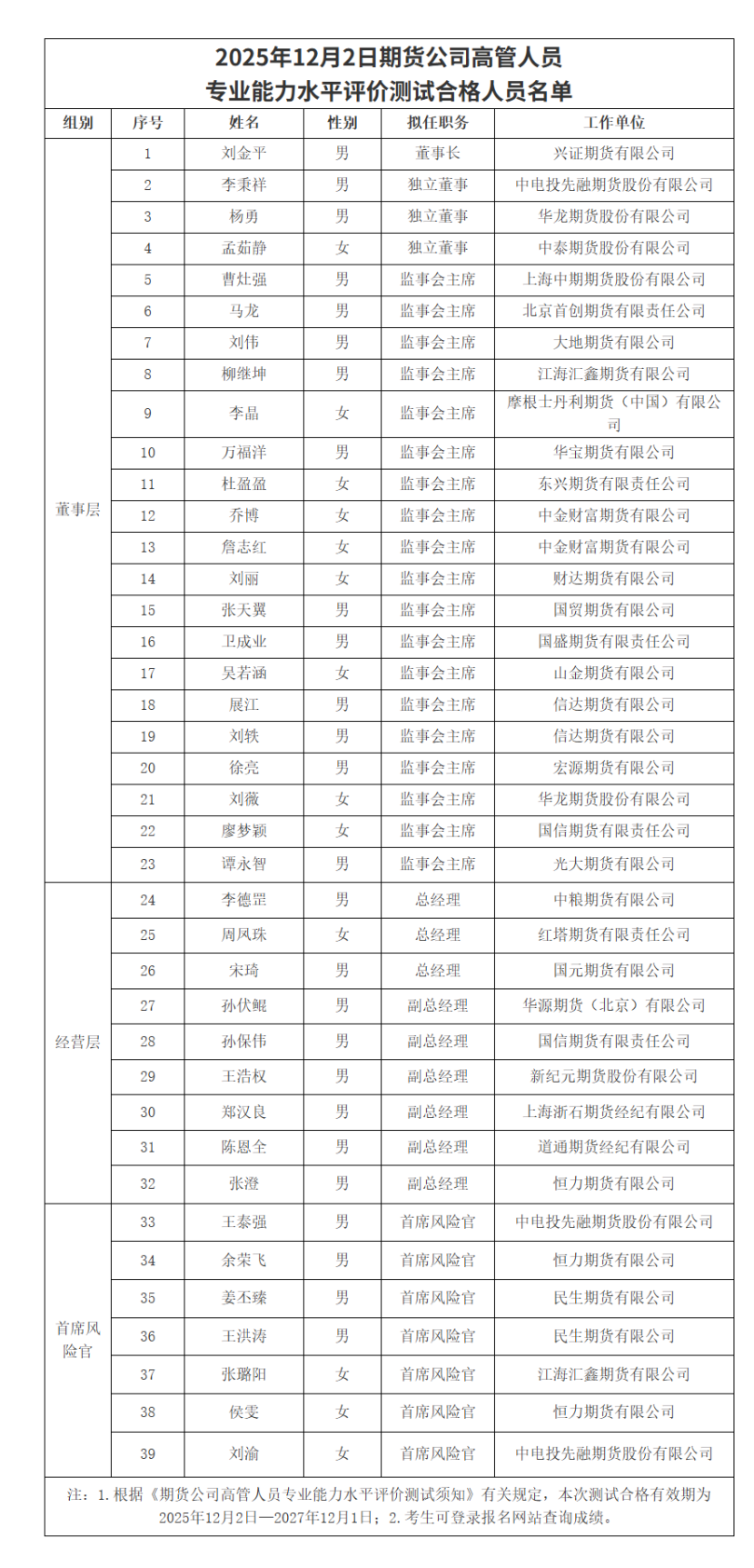 12月2日,中国期货业协会公布新一批期货公司高管人员专业能力水平评价测试合格人员名单,包括兴证期货拟任董事长刘金平、中粮期货拟任总经理李德罡、红塔期货拟任总经理周凤珠、国元期货拟任总经理宋琦等。