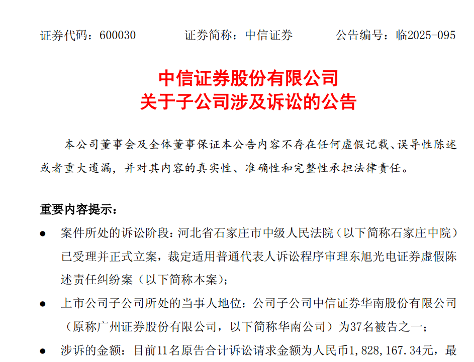 2025年4月9日,中信证券华南收到石家庄中院送达的《起诉状》等应诉材料。2025年8月8日,中信证券华南收到石家庄中院送达的《民事裁定书》[(2025)冀01民初150号]。2025年8月15日,中信证券华南向河北高院申请复议。2025年12月3日,中信证券华南收到河北高院送达的《民事裁定书》[(2025)冀民终690号],裁定驳回中信证券华南等8名复议申请人的复议申请,确定本案适用普通代表人诉讼程序审理,并确定本案权利人范围为自2016年2月15日(含)至2024年7月5日(含)期间以公开竞价方式买入,并于2024年7月5日(含)闭市后当日仍持有东旭光电股票(证券代码:000413),且与本案具有相同种类诉讼请求的投资者。