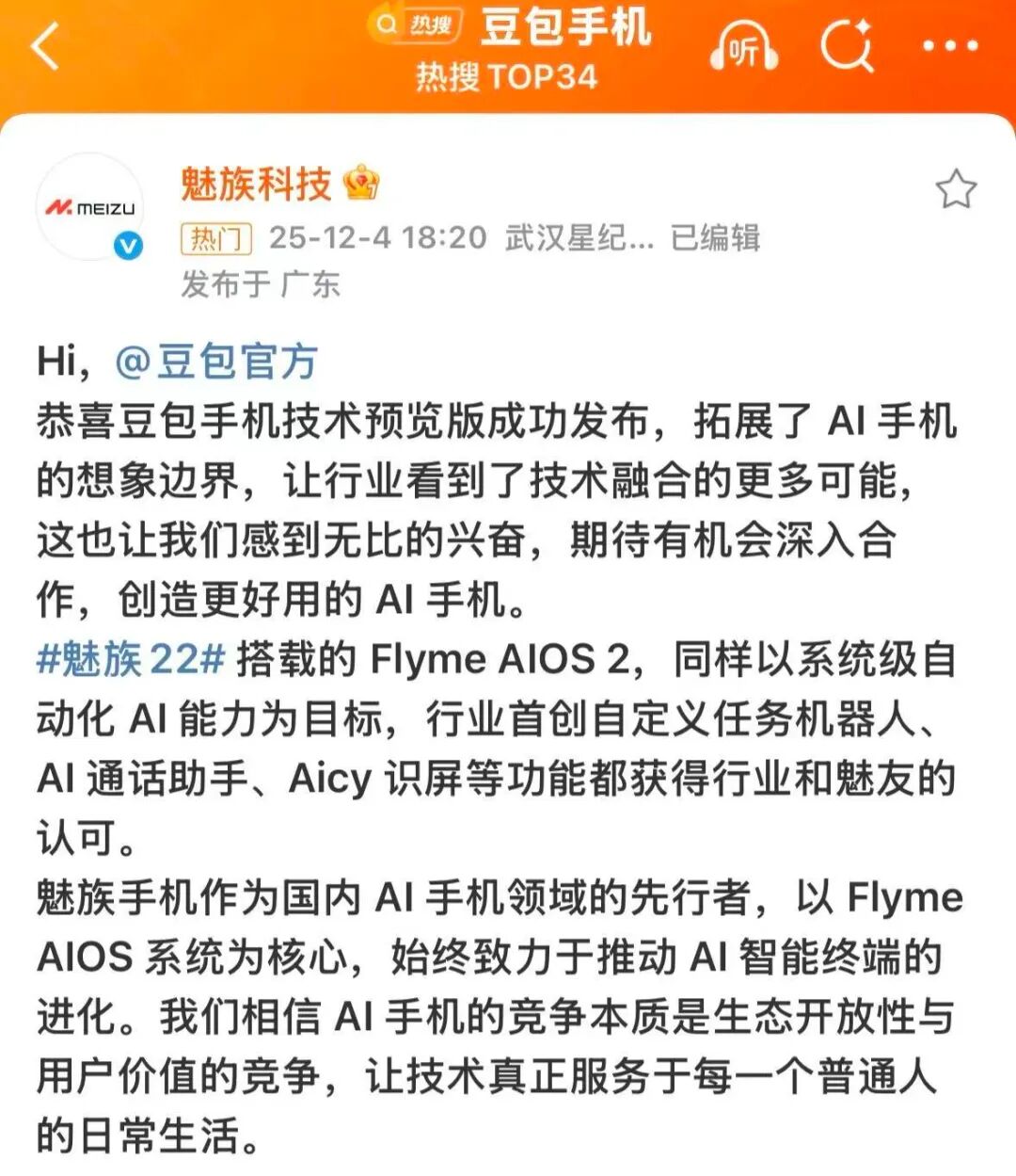 今日,魅族科技官方微博发文@豆包官方,恭喜豆包手机技术预览版成功发布,称赞其“拓展了AI手机的想象边界,让行业看到了技术融合的更多可能,这也让我们感到无比的兴奋”。