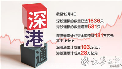 数据显示,截至12月4日,深股通标的数量已达1636只,港股通标的数量增至581只。深港通累计成交金额突破131万亿元,其中深股通累计成交103万亿元,港股通累计成交28万亿元。
