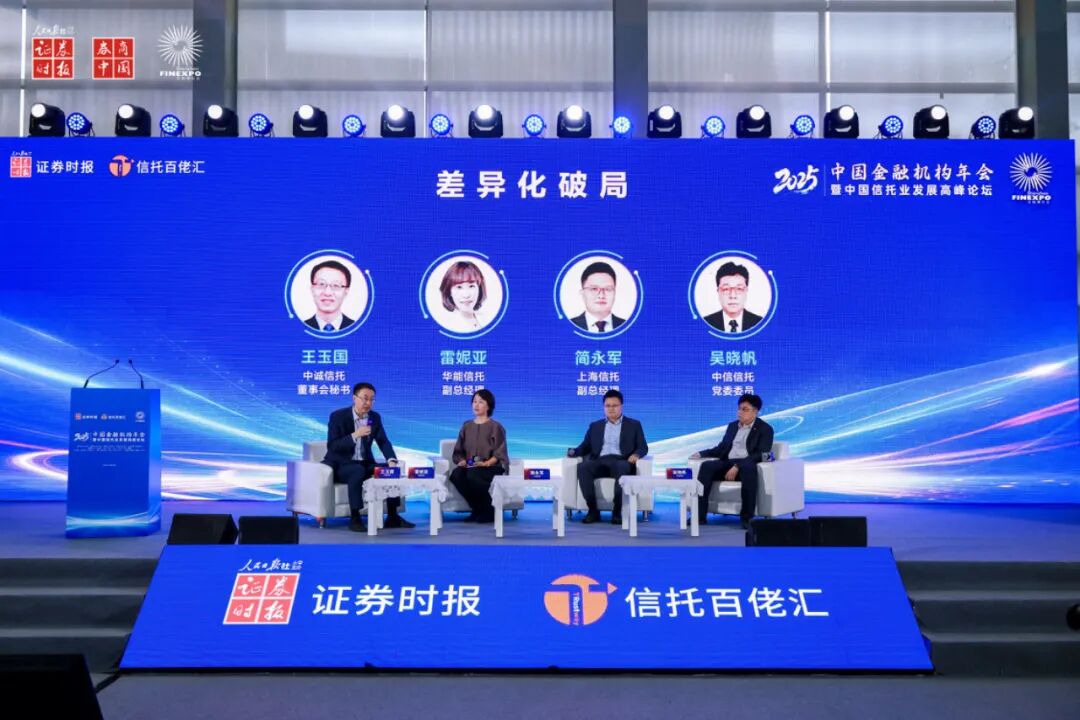 近日,“第十九届深圳国际金融博览会暨2025中国金融机构年会”在深圳举行。在“2025中国信托业发展高峰论坛”分论坛上,行业嘉宾围绕“差异化破局”这一主题展开了深入细致的交流探讨。此次圆桌论坛由中诚信托董事会秘书王玉国担任主持人,参与讨论的行业高管包括华能信托副总经理雷妮亚,上海信托副总经理简永军,中信信托党委委员吴晓帆。