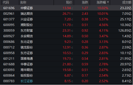 券商板块午后强势拉升,截至收盘,中银证券、瑞达期货涨停,兴业证券涨超5%,湘财股份、东方财富涨超4%。