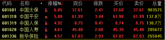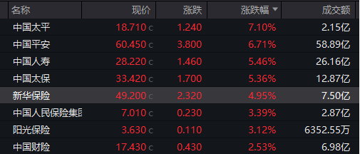 港股方面,中国太平、中国平安涨约7%,中国人寿、中国太保、新华保险涨约5%。