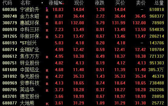 稀土板块午后发力上扬,截至收盘,宁波韵升涨停,金力永磁、惠城环保涨超8%,中科三环涨逾7%。