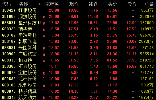 军工板块盘中强势拉升,截至收盘,红相股份、超捷股份20%涨停,星环科技涨超17%,航天动力、航天科技、航天发展等均涨停。