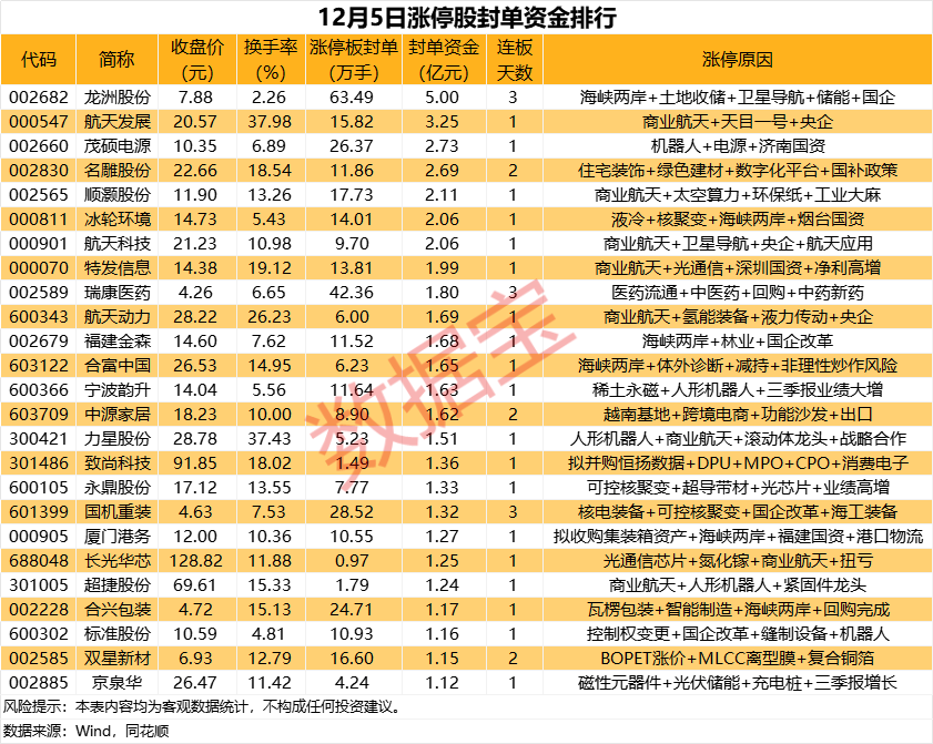 以封单金额计算,30股封单资金均超1亿元,龙洲股份、航天发展、茂硕电源封单资金居前,分别为5亿元、3.25亿元、2.73亿元。