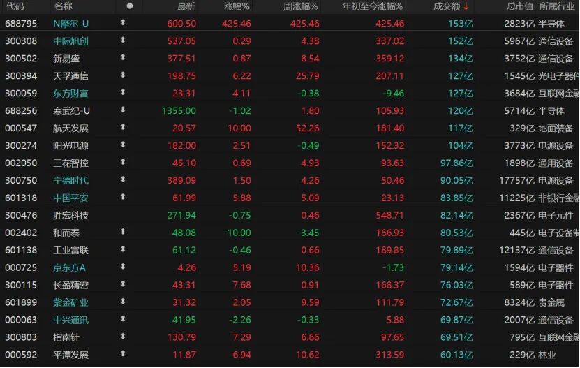 市场赚钱效应较好,共计4387只个股收涨,涨停股80只;975只个股收跌,跌停股12只。摩尔线程上市首日收涨425.46%报600.5元/股,总市值2823亿元,日成交额153亿元。光模块通信概念“易中天”(新易盛、中际旭创和天孚通信)日成交额均超过100亿元,三股今日均收涨,其中天孚通信涨幅超过6%。券商股发力,东方财富收涨4.11%报23.31元/股,保险股中国平安涨近6%报61.99元/股。
