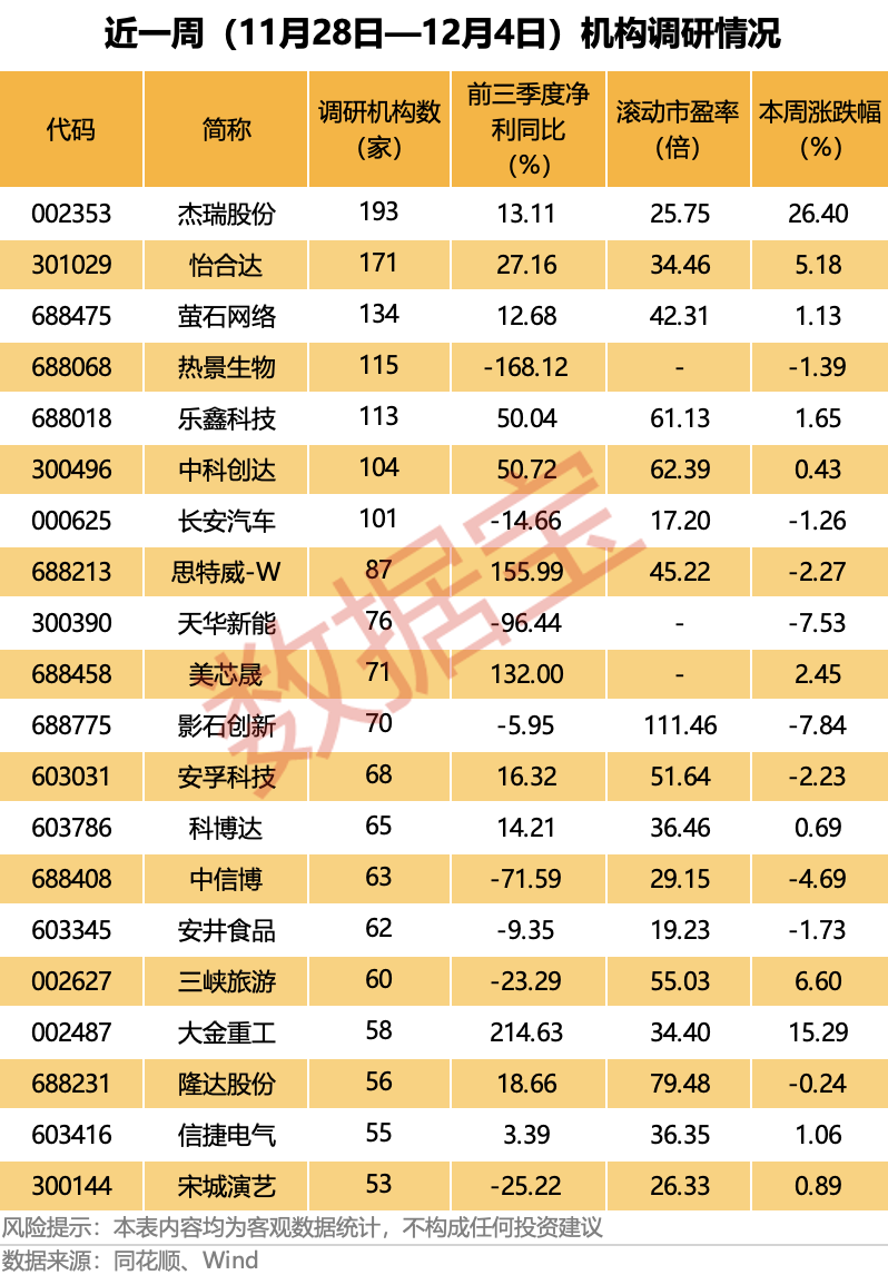 从市场表现来看,近一周机构调研的个股平均上涨0.58%,海欣食品、杰瑞股份、通宇通讯、科翔股份等均逆市涨逾20%。