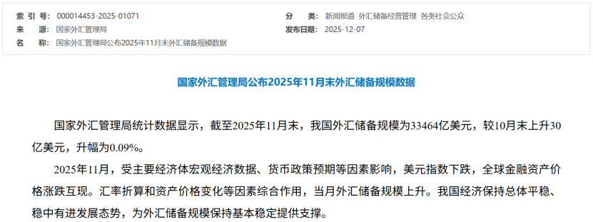 国家外汇管理局12月7日发布的最新统计数据显示,截至2025年11月末,我国外汇储备规模为33464亿美元,较10月末上升30亿美元,升幅为0.09%,继10月后再度刷新自2015年12月以来的规模新高。