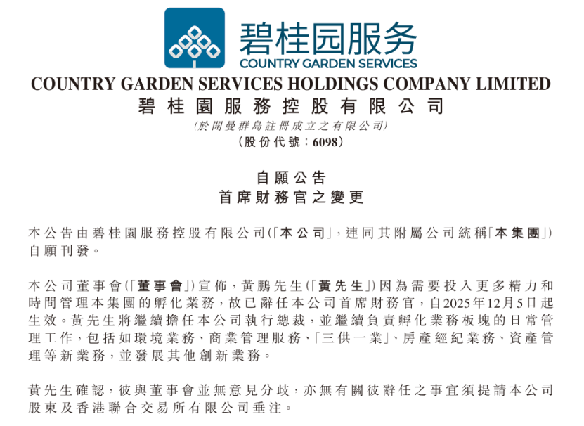 碧桂园服务12月7日发布公告,宣布公司执行总裁、首席财务官黄鹏为集中精力管理集团孵化业务,已辞任首席财务官一职,即日起生效。同时,公司聘任田田为新任首席财务官,将全面负责财务管理及资本市场相关事务。