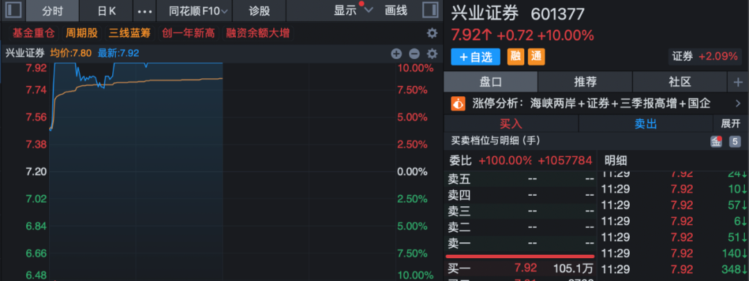 券商股早间大幅高开高走,板块指数盘中一度涨逾3%,半日成交超前一交易日全天成交。板块内所有个股飘红,兴业证券开盘后仅约3分钟垂直涨停,股价创近4年来新高(复权);东北证券、华泰证券、华安证券、国泰海通等涨幅居前。