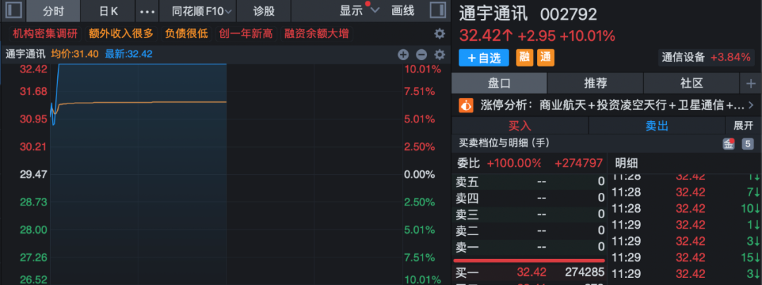 通信股早间集体走强,通信设备方向领涨,板块指数放量飙升逾6%,创历史新高,今年以来累计大涨逾116%。通宇通讯开盘仅约5分钟直线涨停,这已是近8个交易日第5度封板;特发信息也放量直线涨停,天孚通信、光库科技、德科立等涨停或涨超10%。