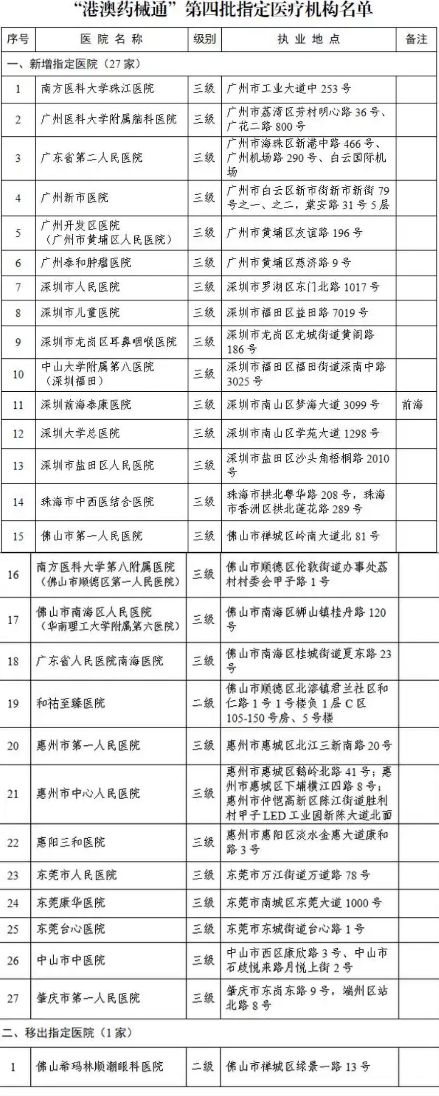人民财讯12月8日电,广东省卫生健康委员会、广东省药品监督管理局发布通知,根据国家《粤港澳大湾区药品医疗器械监管创新发展工作方案》(国市监药〔2020〕159号)和推进“港澳药械通”实施计划,依据相关法规规定,通过地市评估上报,经审核确定粤港澳大湾区“港澳药械通”第四批指定医疗机构名单,包括新增27家、移出1家。