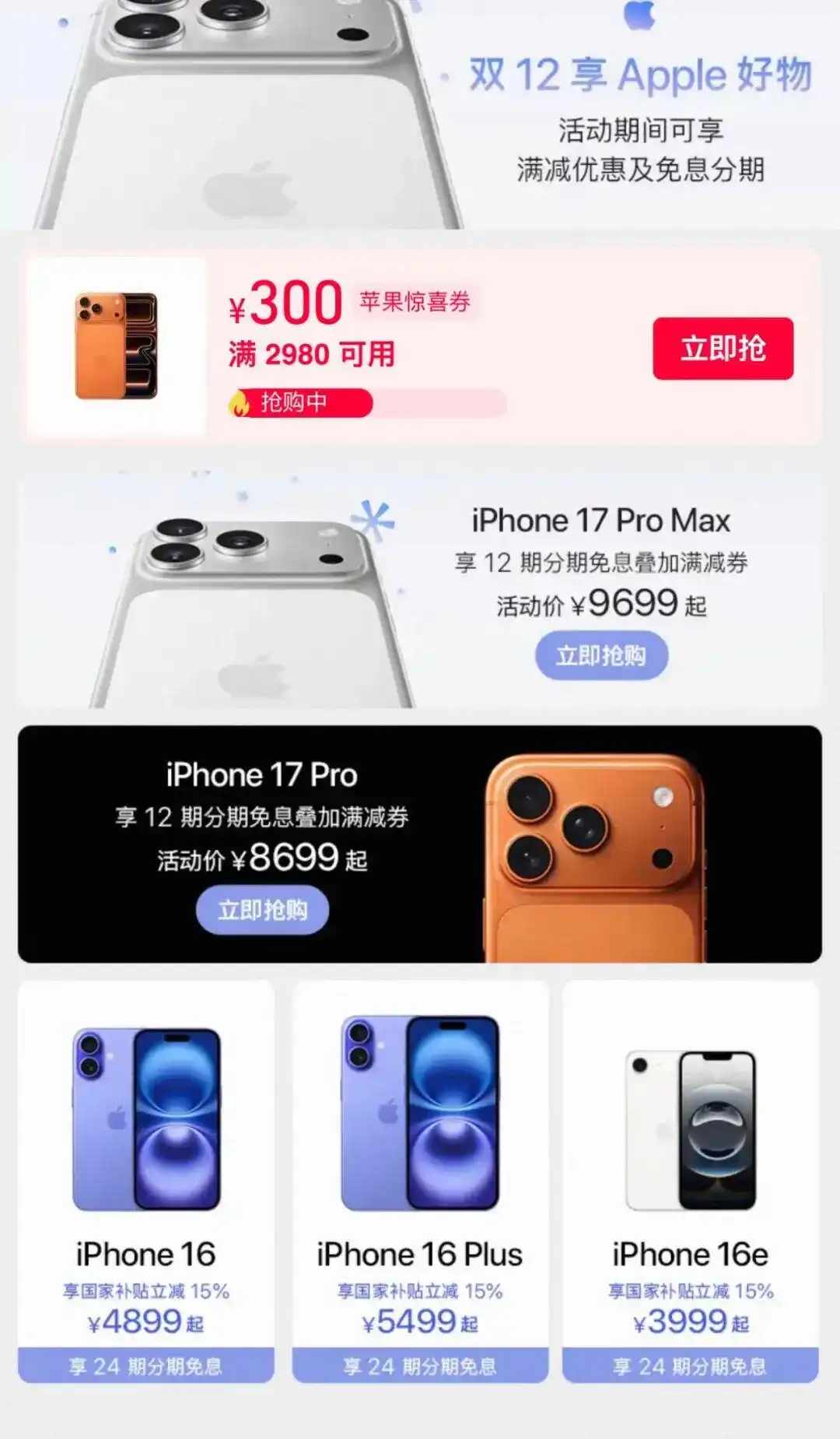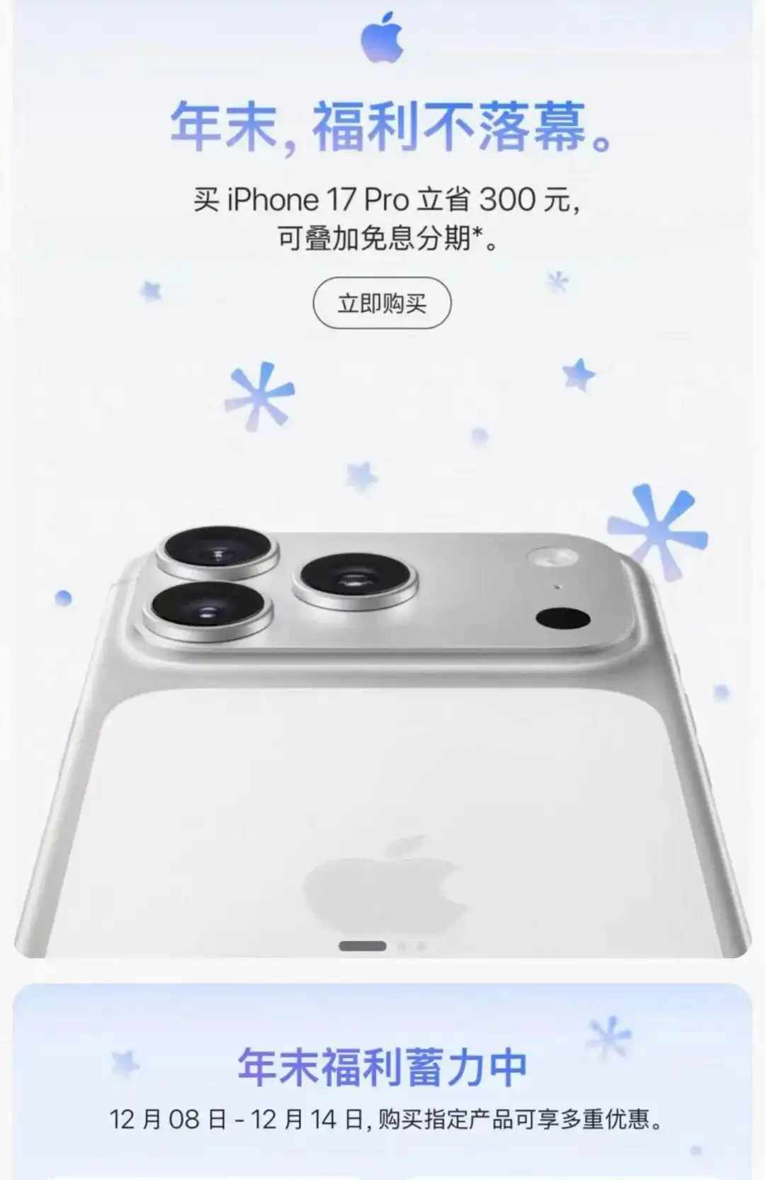 今日,Apple Store官方旗舰店在电商平台推出年末降价活动,iPhone 17 Pro及iPhone 17 Pro Max机型降价300元,降价后iPhone 17 Pro售价8699元起,iPhone 17 Pro Max售价9699元起。