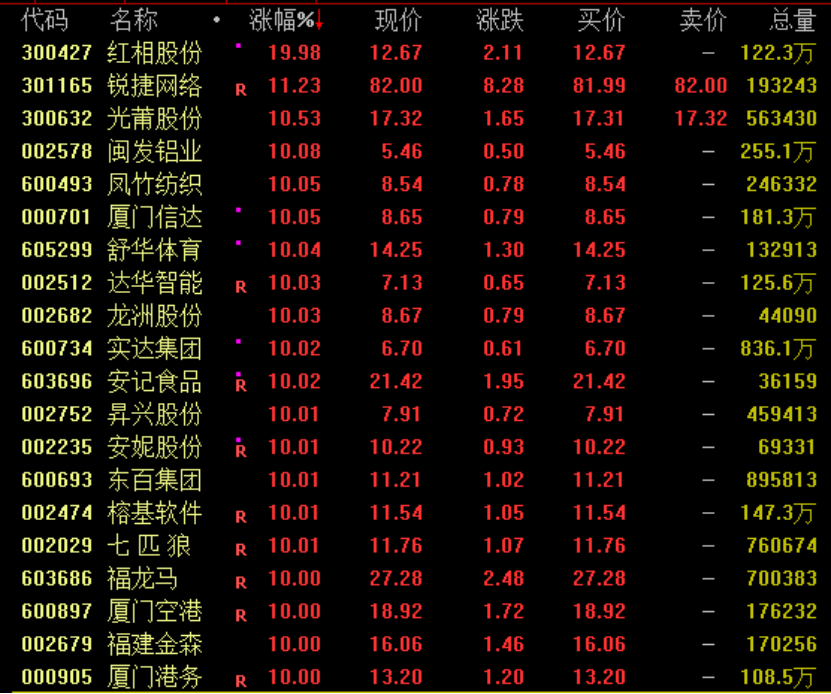 福建本地股盘中集体飙升,红相股份连续两交易日20%涨停,厦门信达、福建金森、厦门空港、厦门港务等均涨停。