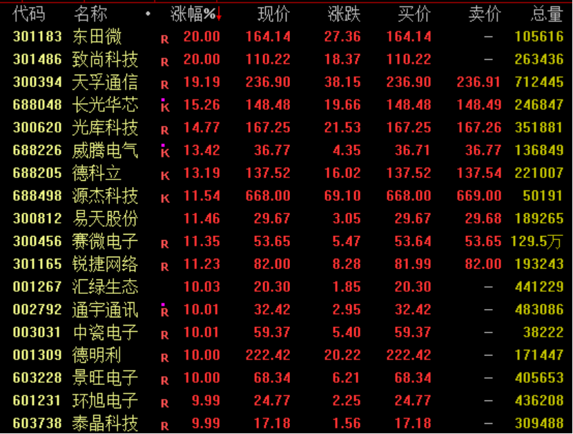 全A超3400股飘红,券商板块盘中拉升,兴业证券一度涨停;福建本地股掀涨停潮,福建金森、厦门空港、厦门港务等涨停;存储芯片概念活跃,香农芯创、江波龙等大涨;CPO概念爆发,东田微、致尚科技20%涨停,天孚通信盘中涨停,源杰科技涨超11%,中际旭创涨超6%,均创历史新高。