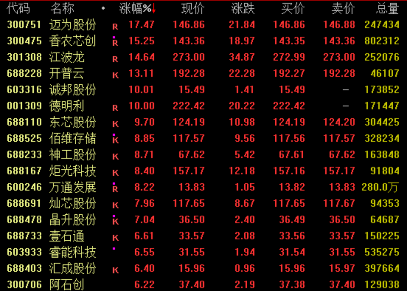 存储芯片概念午后大幅走高,截至收盘,迈为股份涨超17%,盘中一度涨停;香农芯创、江波龙涨约15%,德明利涨停,佰维存储涨近9%。