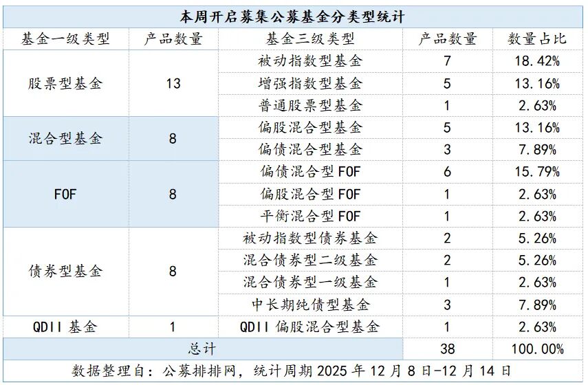 12月8日,公募排排网数据显示,本周(12月8日至12月14日)有38只新基开启募集,数量与前一周基本持平,已连续两周维持在较高水平。