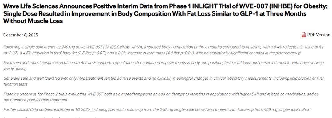 研究显示,单次240毫克剂量的WVE-007可使内脏脂肪减少9.4%,全身脂肪减少4.5%,瘦体重增加3.2%。