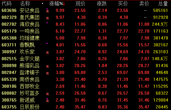 食品饮料板块盘中发力上扬,截至收盘,安记食品、皇氏集团涨停,海欣食品涨超8%,一鸣食品涨逾6%。