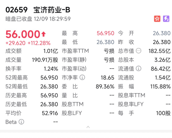 宝济药业在暗盘阶段更是大涨112.28%,总市值达到182.55亿港元。
