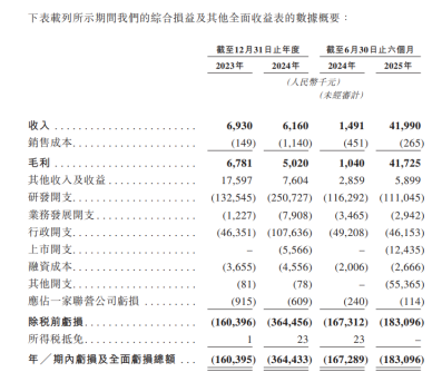 招股书显示,于2023年、2024年以及截至2024年6月30日止及2025年6月30日止六个月,宝济药业分别录得收入人民币0.07亿元、人民币0.06亿元、人民币0.02亿元及人民币0.42亿元,该等收入来自于销售材料、提供技术服务以及根据许可及商业化协议收取的首付款。宝济药业目前概无任何产品获批进行商业销售,并于往绩记录期持续亏损。