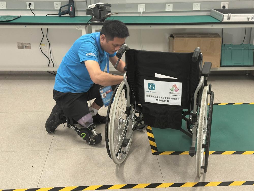 走进康复辅具保障服务站,辅助器具维修管理员王楷鹏正在为运动员维修轮椅,他右腿佩戴假肢却行动自如,蹲地检查刹车、扶手、按钮等部件的动作行云流水。