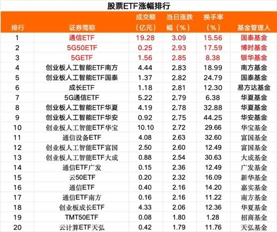 从股票ETF二级市场表现看,通信、5G板块领涨。当日,通信ETF(国泰)、5G50ETF(博时)、5GETF(银华)涨幅居前,成长ETF(易方达)、5G通信ETF(华夏),以及南方、国泰、华夏、华安、华宝旗下创业板人工智能ETF涨幅均超2%。