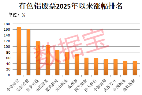 作为第一大有色金属产业,铝产业相关的股票二级市场走势也同样不俗。数据显示,今年以来有色铝股票平均上涨48.13%,其中4股累计涨幅翻倍,分别为中孚实业、宏创控股、宜安科技、云铝股份。