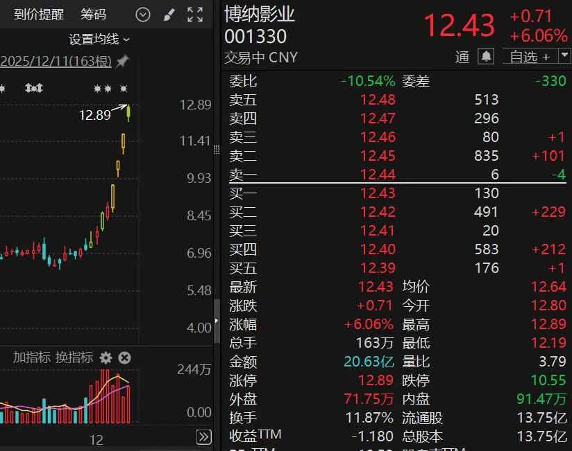 盘初,影视院线板块拉升,博纳影业(001330)盘中触及涨停,走出4连板,北京文化、中国电影、金逸影视、华策影视、幸福蓝海冲高。