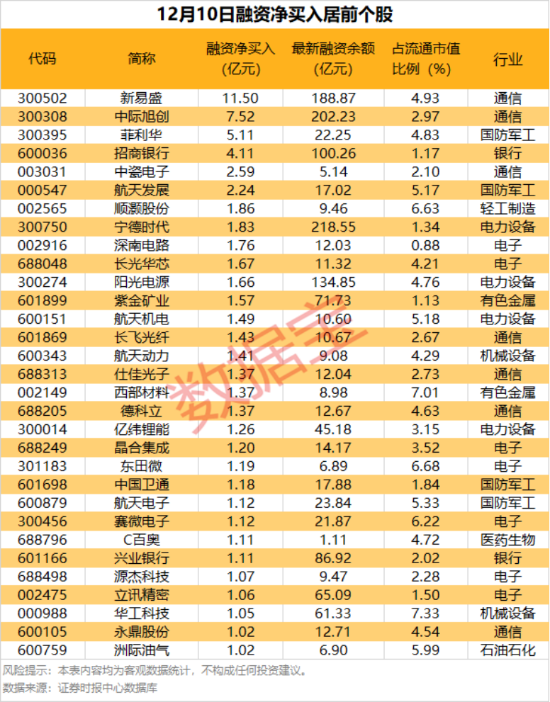 具体到个股,12月10日获融资净买入千万元以上的有370只,其中31只融资净买入额超1亿元。新易盛融资净买入额居首,当日净买入11.50亿元;其次是中际旭创、菲利华,融资净买入金额分别为7.52亿元、5.11亿元;融资净买入金额居前的还有招商银行、中瓷电子、航天发展等。
