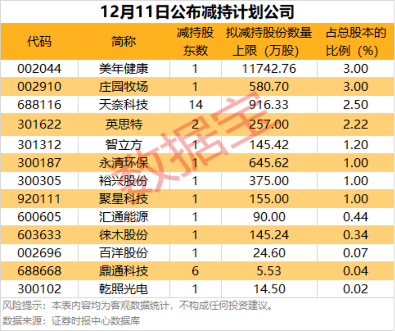 12月11日,13家公司发布了减持计划,拟减持比例居前的有美年健康、庄园牧场等。
