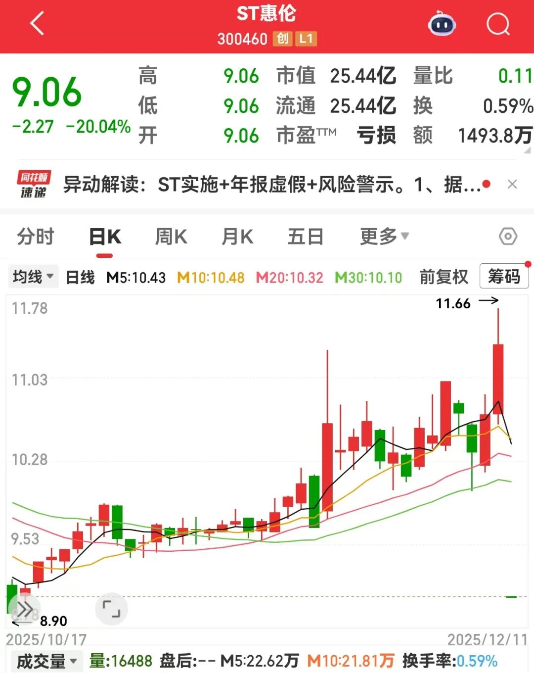 12月11日,ST惠伦(300460)复牌“一”字跌停,截至上午收盘,该股跌停板封单33.16万手。
