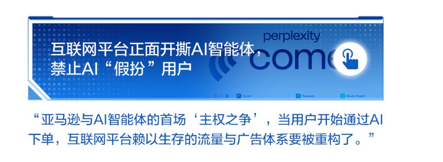 在大洋彼岸,冲突已经从明枪暗箭上升至正面法律对抗。11月,亚马逊起诉AI公司Perplexity,指控其浏览器智能体Comet伪装成人类用户、秘密访问并操控亚马逊账户购物,违反了计算机欺诈罪等法律。Perplexity则反击称智能体只是用户的“代理”,将亚马逊的诉讼称为对创新的“霸凌”。
