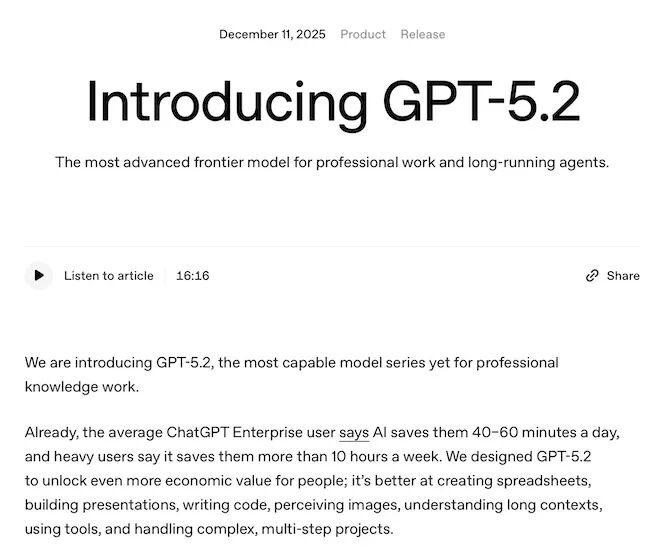根据 OpenAI 公布的信息,GPT-5.2 在信息检索、写作、翻译、数学推演与编程任务中进一步提速,并能够处理更长、更复杂的推理链条。模型在电子表格生成、演示文稿搭建和跨步骤工作流等企业常见场景中表现更为稳定。