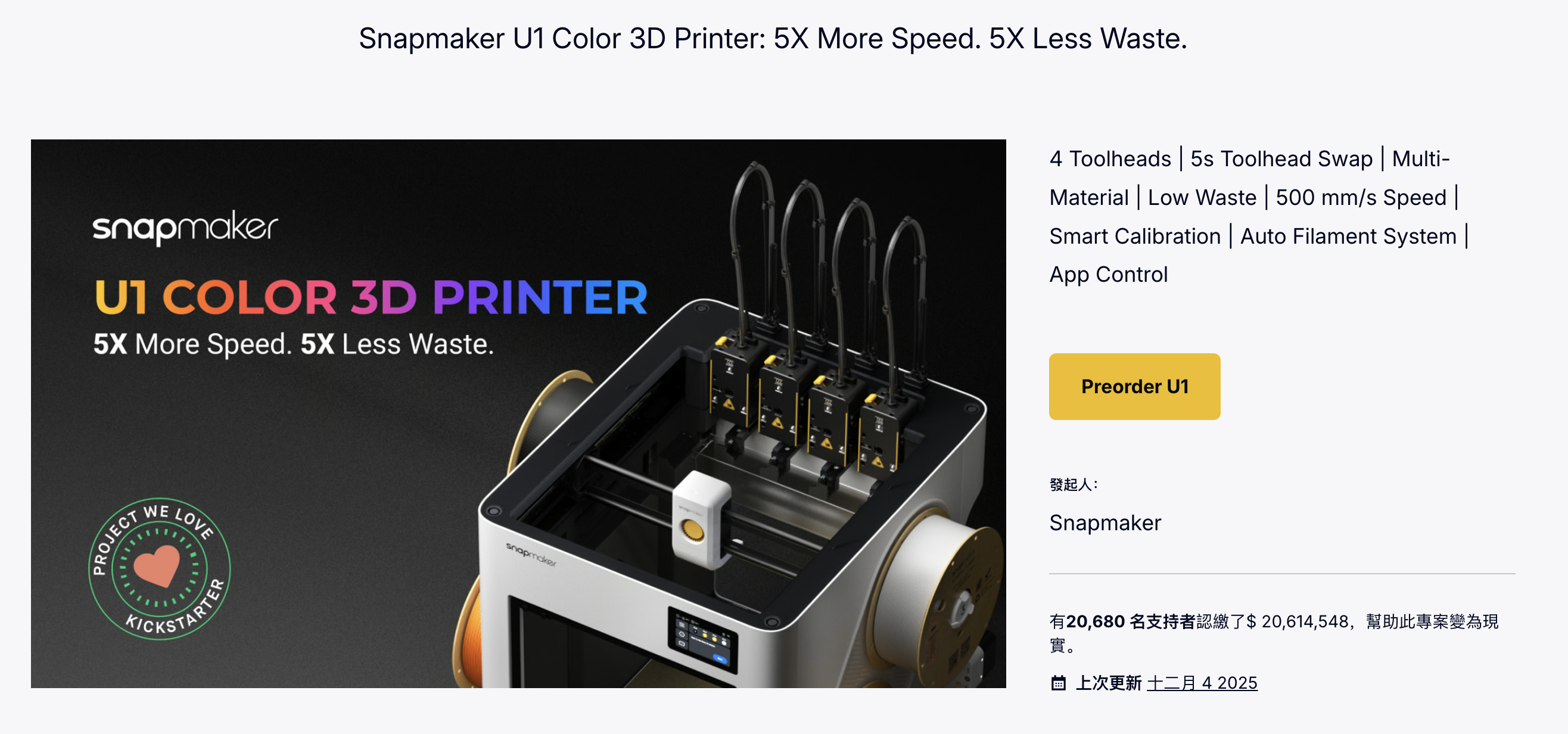 Snapmaker是今年3D打印行业炙手可热的一家公司。今年8月,其推出的3D打印机Snapmaker U1,在Kickstarter上获得超2000万美元(约1.5亿人民币)的众筹成绩,刷新3D打印机历史众筹金额最高记录,国内官方售价则为5999元。