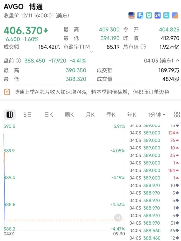 12月12日,博通股价在法兰克福市场大幅跳水,一度暴跌近5%。另外,在美股周五盘前交易中,博通股价也直线跳水,一度大跌超4%。