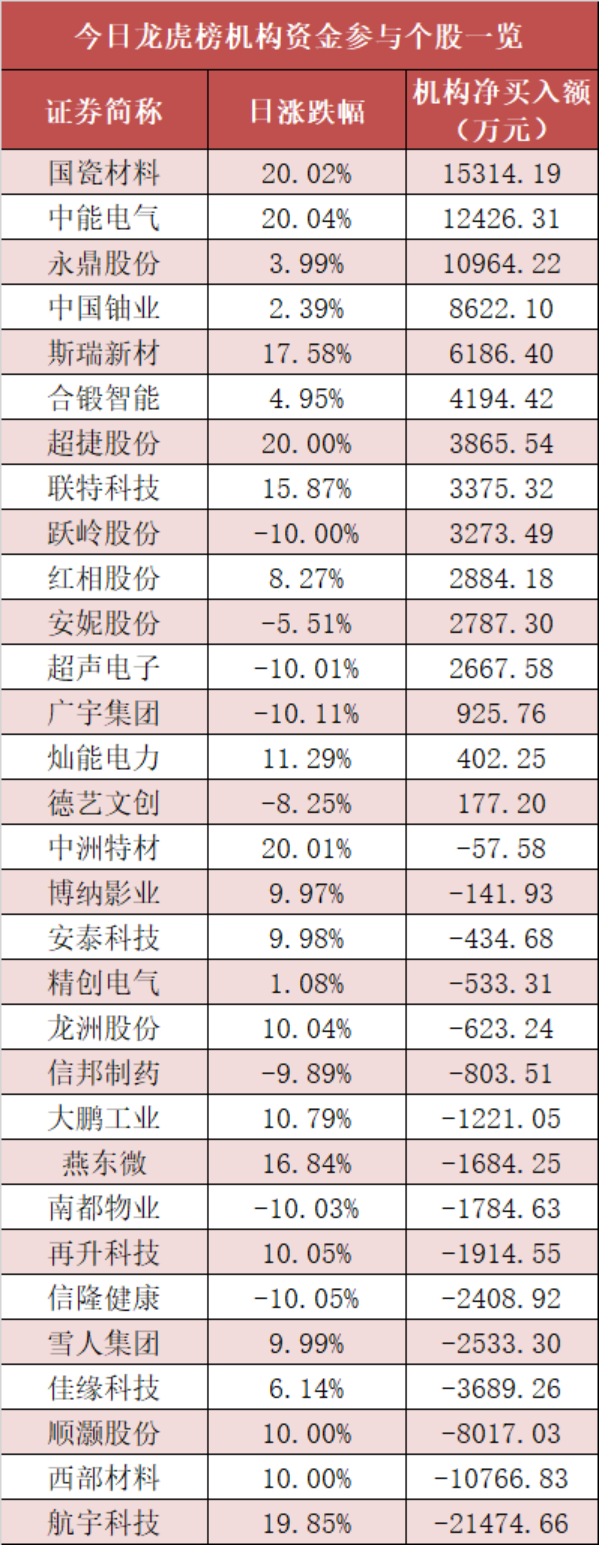 盘后龙虎榜数据显示,机构现身多股,其中国瓷材料等股票呈现机构资金净买入,航宇科技等股票呈现机构资金净卖出。