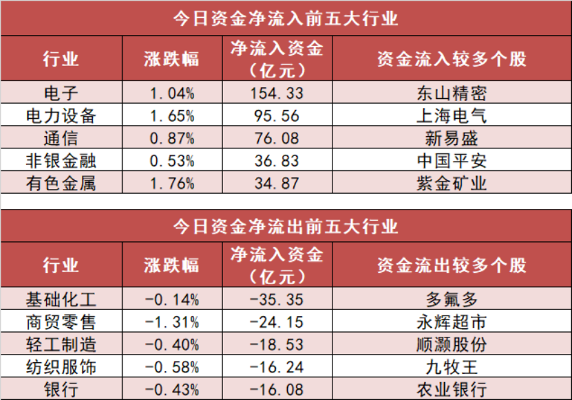 申万一级行业中,14个行业实现资金净流入,其中电子行业净流入154.33亿元居首。