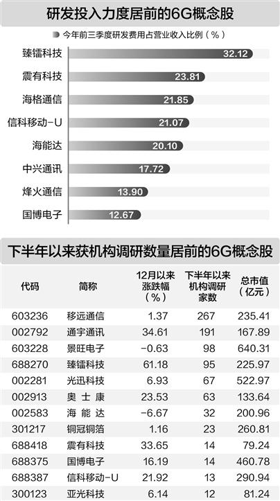 财报数据显示,6G概念股积极进行技术研发,8股今年前三季度研发费用占营业收入比例超过10%,臻镭科技、震有科技、海格通信居前,分别达到32.12%、23.81%、21.85%。