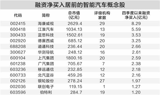 证券时报·数据宝梳理了今年四季度以来(截至12月15日),融资资金净买入额逾1亿元的智能汽车概念股,共计13只。海康威视、江淮汽车、蓝思科技、德赛西威融资净买入额居前,依次为8.29亿元、5.59亿元、3.53亿元、3.25亿元。