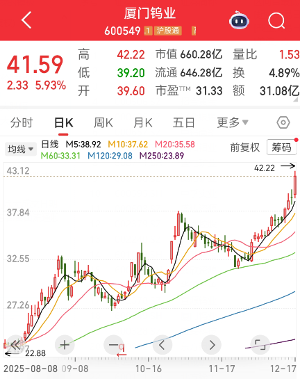 人民财讯12月17日电,12月17日,厦门钨业收盘上涨5.93%,最新收盘价创历史新高。截至目前,该股年内累计涨幅达到121.57%,最新A股市值升至660.28亿元。公司今年前三季度实现净利润17.82亿元,同比增长27.05%。