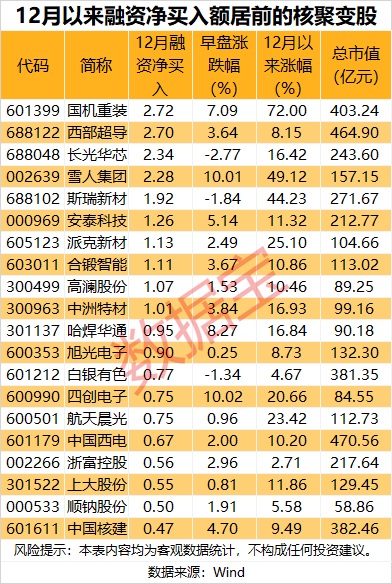 资金流向上来看,12月以来核聚变板块获得杠杆资金显著加仓,合计融资净买入金额达到10.52亿元,10股融资净买入超1亿元,国机重装、西部超导、长光华芯融资净买入金额居前,分别达到2.72亿元、2.7亿元、2.34亿元。