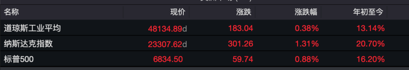 周五(12月19日),欧美股市集体收涨。美股方面,三大股指全线收涨,道琼斯工业指数涨0.38%报48134.89点,标普500指数涨0.88%报6834.5点,纳斯达克指数涨1.31%报23307.62点。本周,道琼斯工业指数跌0.67%,标普500指数涨0.1%,纳斯达克指数涨0.48%。
