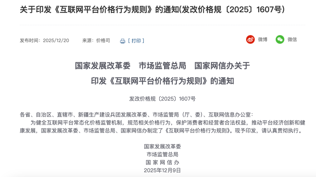此前,国家发展改革委、市场监管总局、国家网信办于2025年8月23日至9月22日就《行为规则》公开征求社会意见。根据各方意见,进一步修改完善《行为规则》,着力规范价格行为、推动公开透明、增强各方协同,构建良好平台生态。