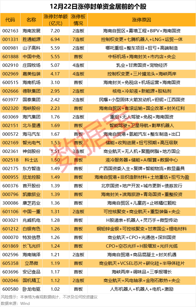 以封单金额计算,海南发展、胜通能源、山子高科涨停板封单资金居前,分别为7.2亿元、6.94亿元、5.59亿元。