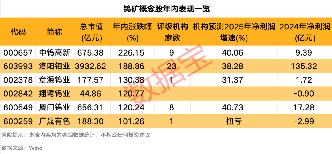 从年内涨跌幅来看,6只钨矿股股价全部翻倍。中钨高新涨幅居首,为226.15%;洛阳钼业涨幅随后,为188.86%。