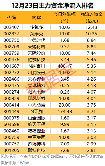 多氟多主力资金净流入12.48亿元,居首。锂电池概念今日震荡走强,多氟多涨停。