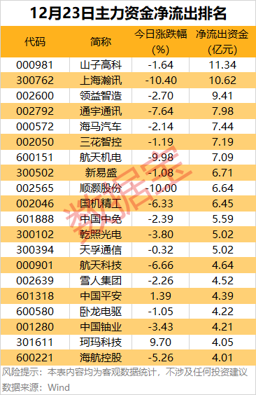 今日有68股主力资金净流出均超2亿元,其中,山子高科、上海瀚讯、领益智造、通宇通讯、海马汽车、三花智控、航天机电净流出金额均超7亿元。